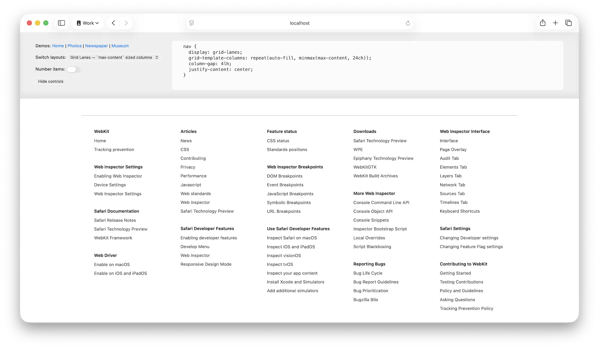 立即在 Safari Technology Preview 234 中体验 Grid Lanes !所有位于 webkit.org/demos/grid3 的演示均已更新为新语法,包含 Grid Lanes 的其他应用场景。它不仅适用于图片!例如,充满链接的巨型菜单页脚布局突然变得轻松自如。