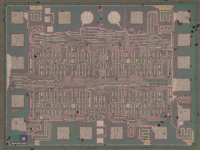 上图是显微镜下的微型硅芯片。硅的各个区域都掺入了杂质,以改变硅的电气特性。这种掺杂还能使硅的各个区域呈现绿色或红色,具体取决于某个区域的掺杂方式。(在硅的顶部,可以看到白色的金属层,形成芯片的连接。这种芯片使用的是金属栅极晶体管,这是一种古老的技术,因此金属层也构成了晶体管的栅极。在芯片外围,16 个方形键合焊盘将芯片与外界连接起来。安装到封装中时,芯片在焊盘和引线框架(连接芯片引脚的金属结构)之间有微小的键合线。