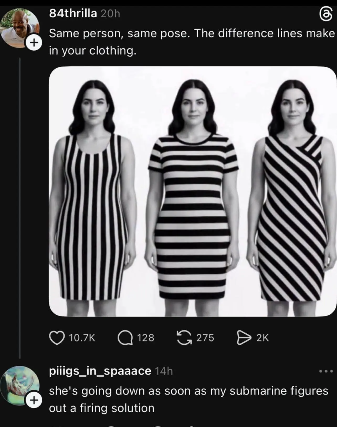2011年一项研究发现,当受试者观察穿着横条纹与竖条纹服装的相同模特时,穿着横条纹的模特“需要宽10.7%才能被感知为与竖条纹模特相同”(Thompson & Mikellidou)。